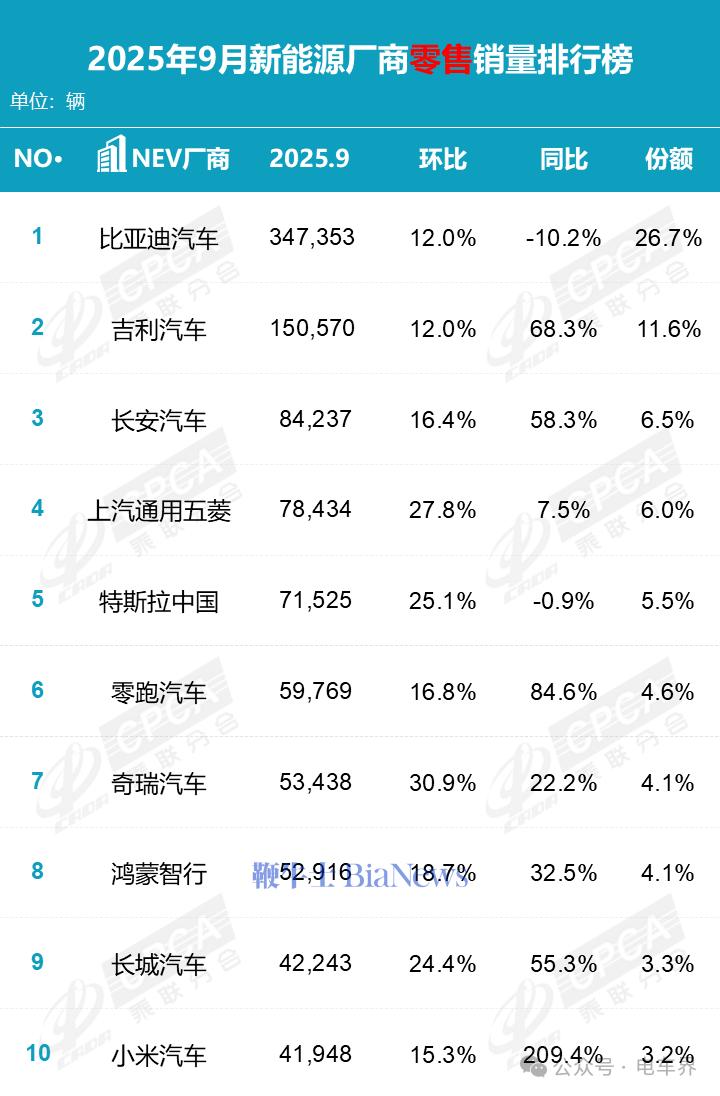 11.6%的市场份额使其保持了新能源汽车零售销量第二的排名,但低于8月份的12.1%。