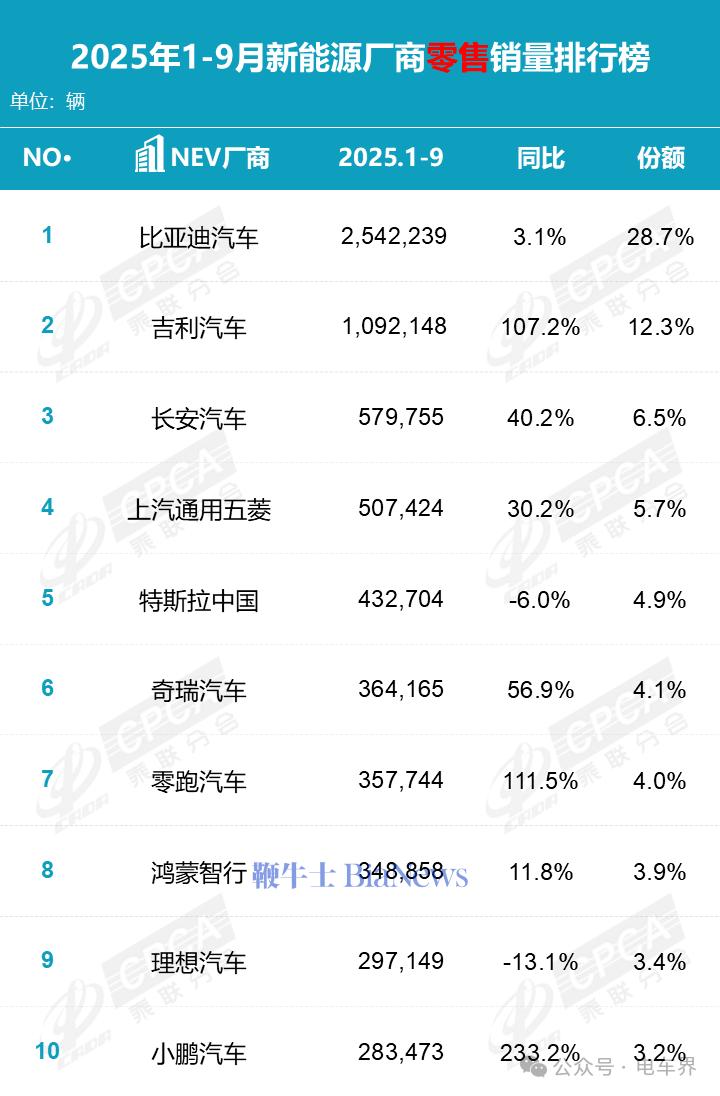 1-9月,比亚迪以2,542,239辆的零售销量和28.7%的市场份额引领中国新能源汽车市场。